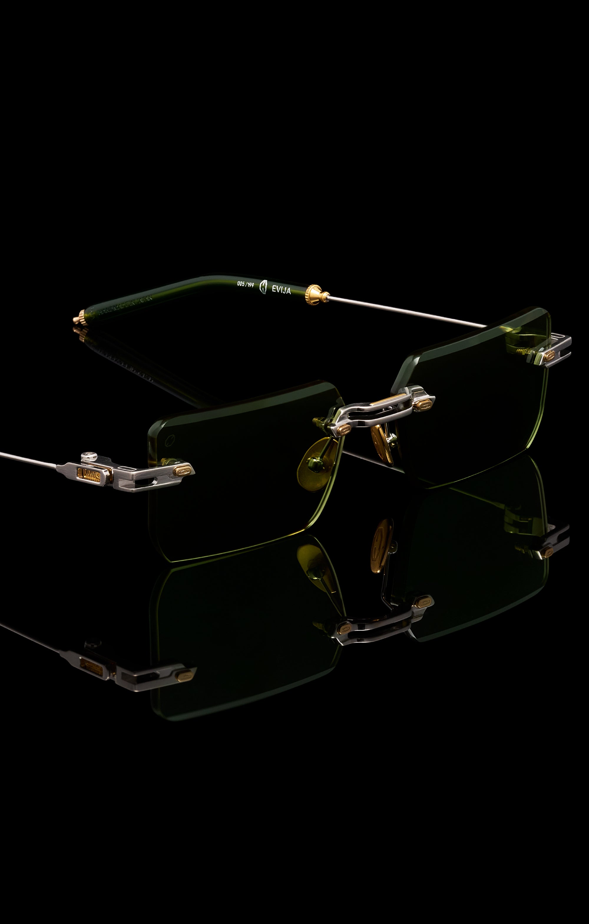 Beta Titanium Construction featuring modular vented components with 18K gold electroplating, along with flex temple systems adorned with cellulose adjustable acetate temple tips and two-tone decors at each end. Detailed and hand finished two-tone Monoblock connections. Custom 4mm Rimless lens features a Hand-Painted matte edge finish, finished with both Anti-Reflective and Scratch Resistant coatings, drilled and notched to accommodate titanium components.