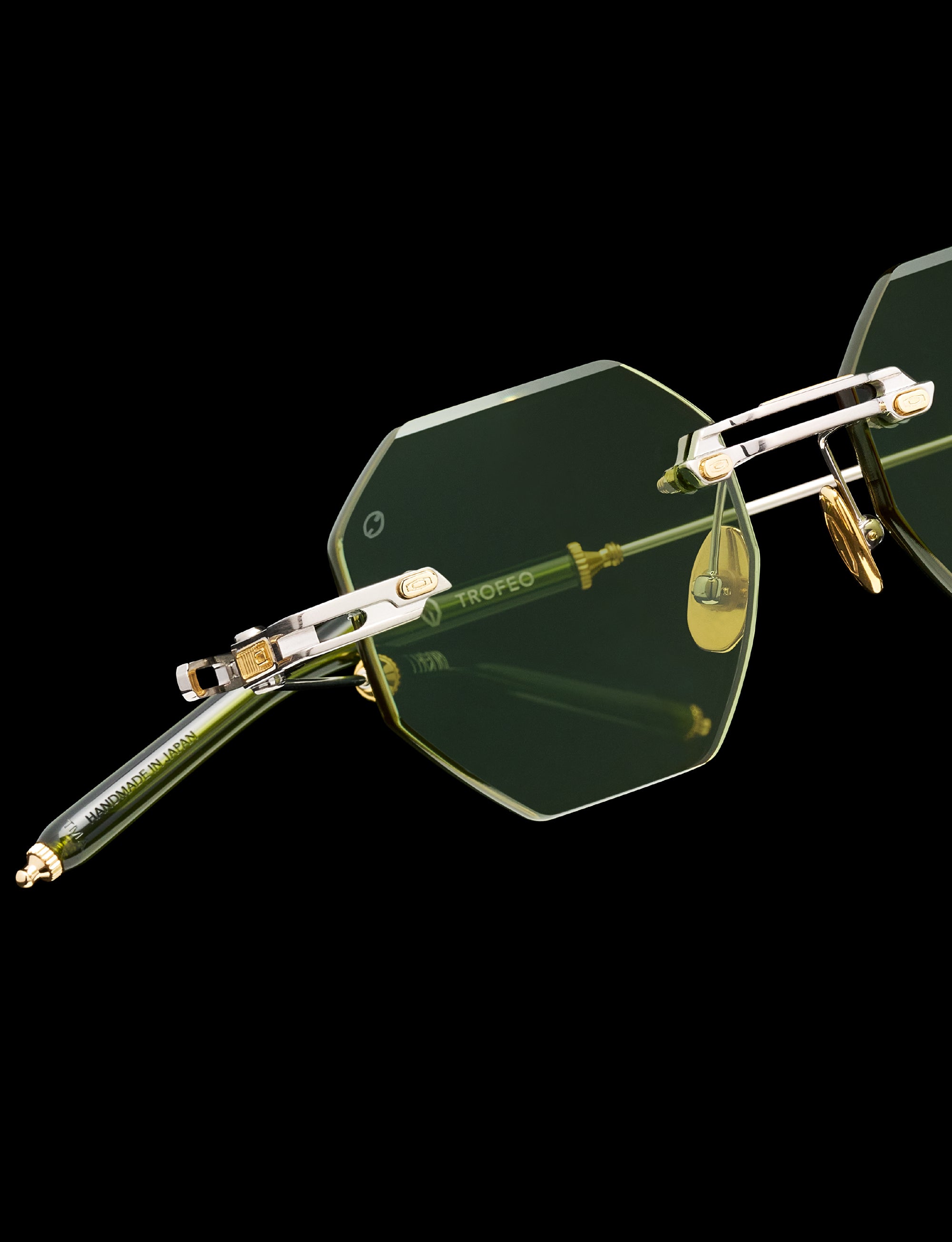 Beta Titanium Construction featuring modular vented components with 18K gold electroplating, along with flex temple systems adorned with cellulose adjustable acetate temple tips and two-tone decors at each end. Detailed and hand finished two-tone Monoblock connections. Custom 4mm Rimless lens features a Hand-Painted matte edge finish, finished with both Anti-Reflective and Scratch Resistant coatings, drilled and notched to accommodate titanium components.