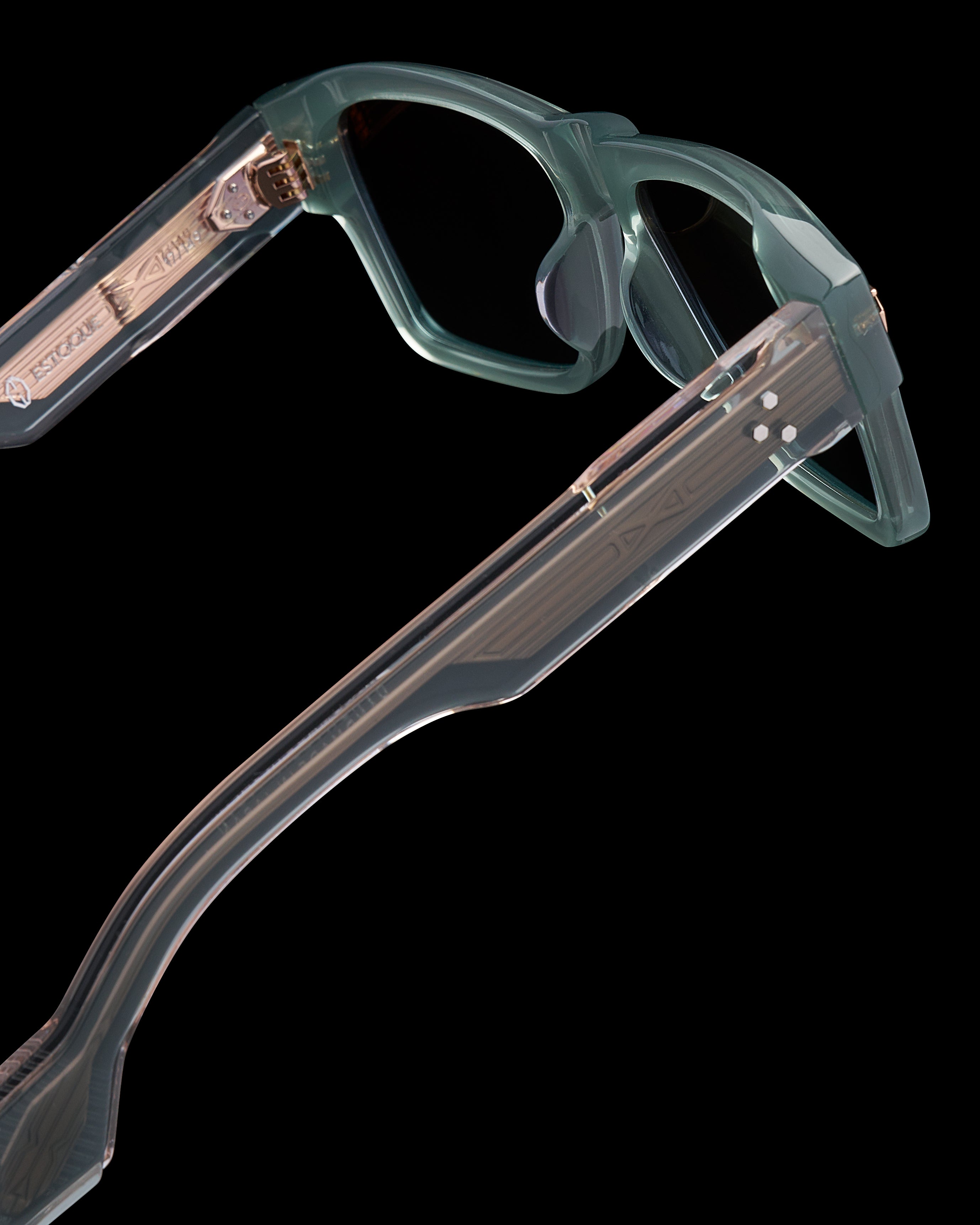 Sterling silver front decors or 18K gold plated with two-tone enamel detail. Voluminous 7mm temples with clear crystal lamination construction showcasing our intricate piston core-wire system. Powered by a 7-barrel hinge with titanium décor plates and anchored with signature octagon rivets. Thoughtfully equipped with a custom non-slip grip.