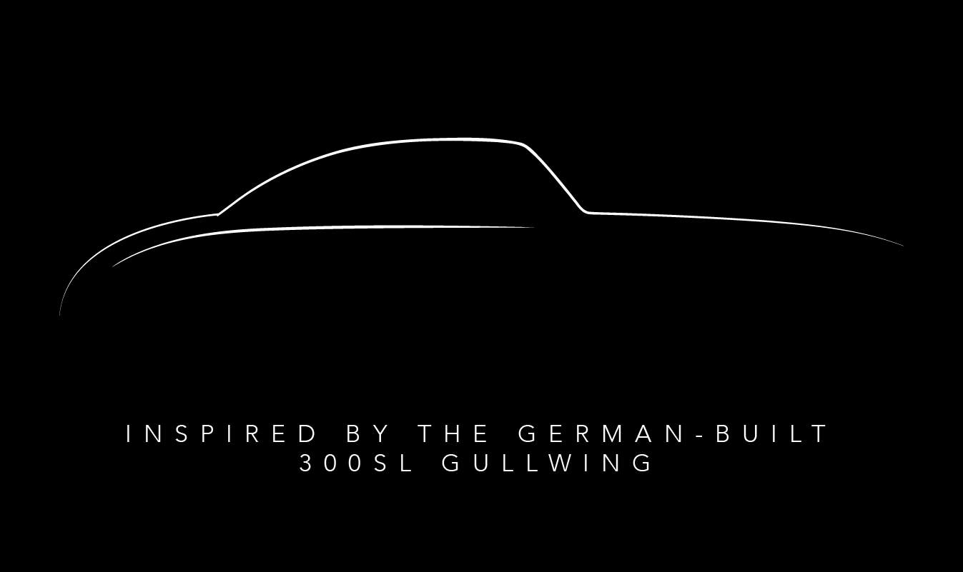 - Hand-drawn design inspired by the German-built 300SL Gullwing.